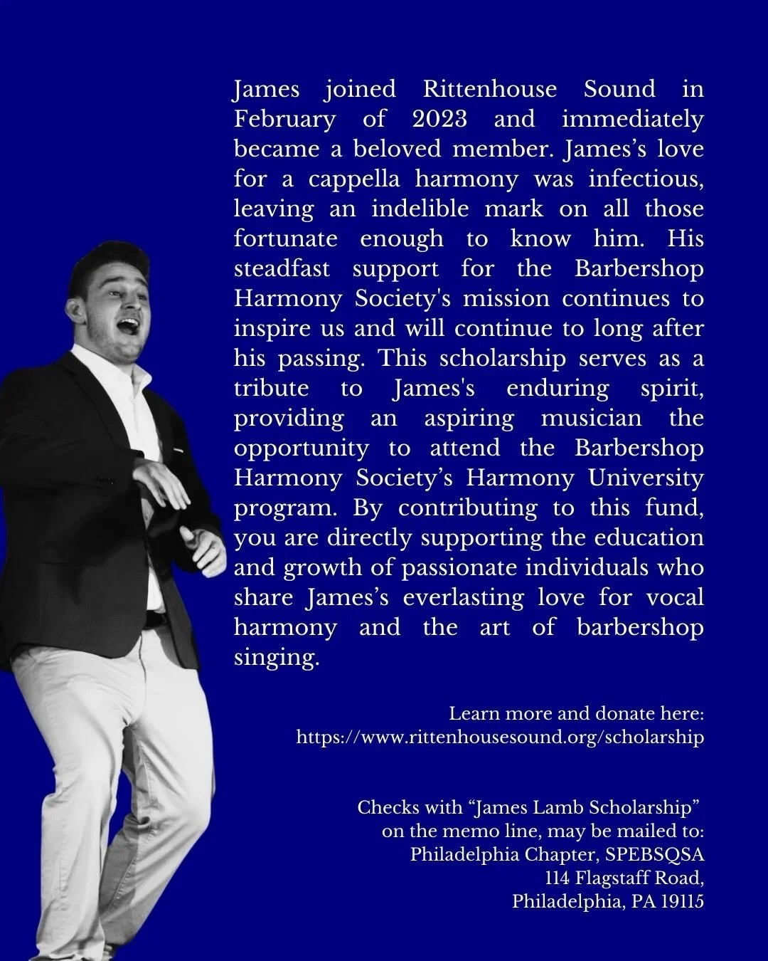 It is with immeasurable sorrow that Rittenhouse Sound announces the passing of our dearly cherished singer James Lamb. Please visit the James Lamb Memorial Scholarship page for more about his legacy to our organization.